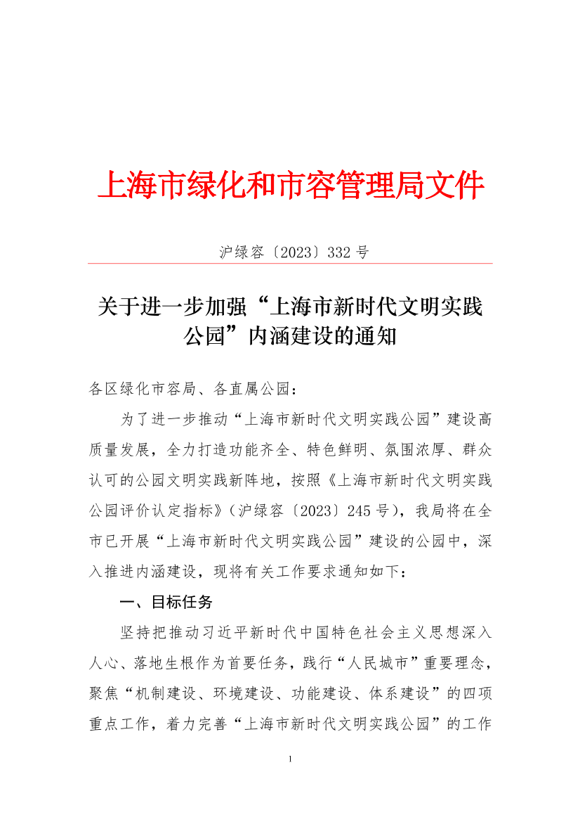 为了进一步推动“上海市新时代文明实践公园”建设高质量发展,全力打造功能齐全、特色鲜明、氛围浓厚、群众认可的公园文明实践新阵地,按照《上海市新时代文明实践公园评价认定指标》(沪绿容〔2023〕245号),我局将在全市已开展“上海市新时代文明实践公园”建设的公园中,深入推进内涵建设,现将有关工作要求通知如下: