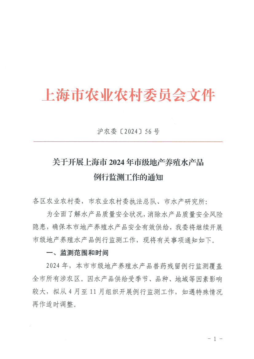 2024年,本市市级地产养殖水产品兽药残留例行监测覆盖全市所有涉农区。因水产品供给受季节、品种、地域等因素影响较大,拟从4月至11月组织开展例行监测工作,如遇特殊情况再作适时调整。