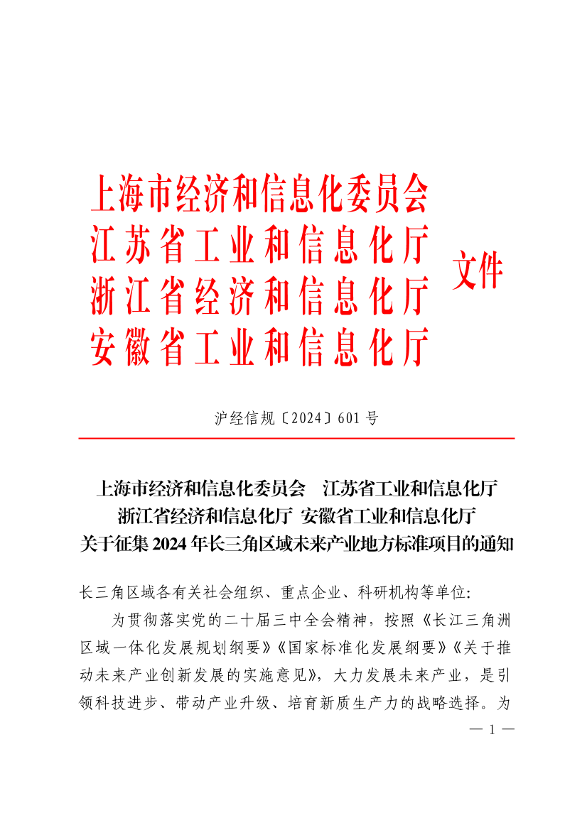 为贯彻落实党的二十届三中全会精神,按照《长江三角洲区域一体化发展规划纲要》《国家标准化发展纲要》《关于推动未来产业创新发展的实施意见》,大力发展未来产业,是引领科技进步、带动产业升级、培育新质生产力的战略选择。为进一步推进长三角区域未来产业工作,发挥产业创新标准引领作用,现开展2024年长三角区域未来产业地方标准项目征集工作。具体要求如下: