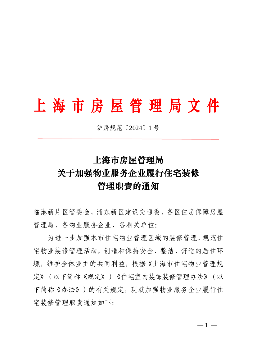 为进一步加强本市住宅物业管理区域的装修管理,规范住宅物业装修管理活动,创造和保持安全、整洁、舒适的居住环境,维护全体业主的共同利益,根据《上海市住宅物业管理规定》(以下简称《规定》)《住宅室内装饰装修管理办法》(以下简称《办法》)的有关规定,现就加强物业服务企业履行住宅装修管理职责通知如下: