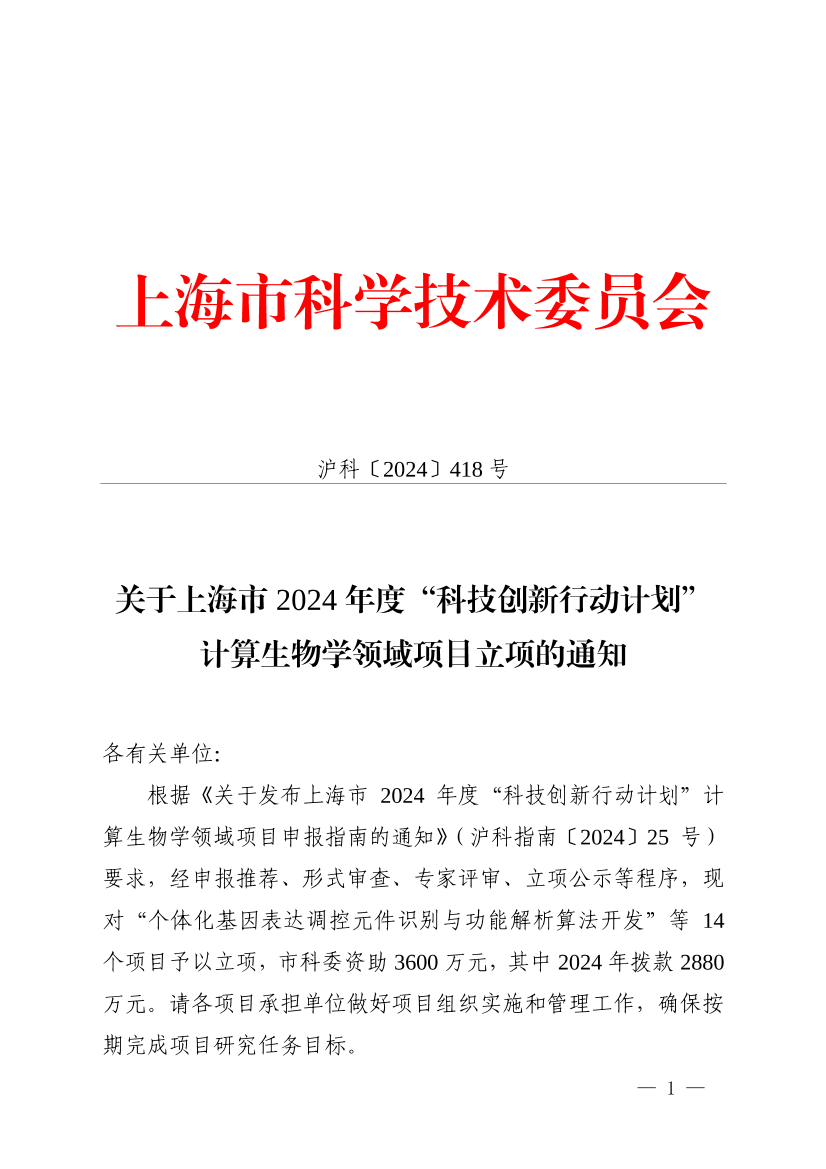 根据《关于发布上海市2024年度“科技创新行动计划”计算生物学领域项目申报指南的通知》(沪科指南〔2024〕25号)要求,经申报推荐、形式审查、专家评审、立项公示等程序,现对“个体化基因表达调控元件识别与功能解析算法开发”等14个项目予以立项,市科委资助3600万元,其中2024年拨款2880万元。请各项目承担单位做好项目组织实施和管理工作,确保按期完成项目研究任务目标。