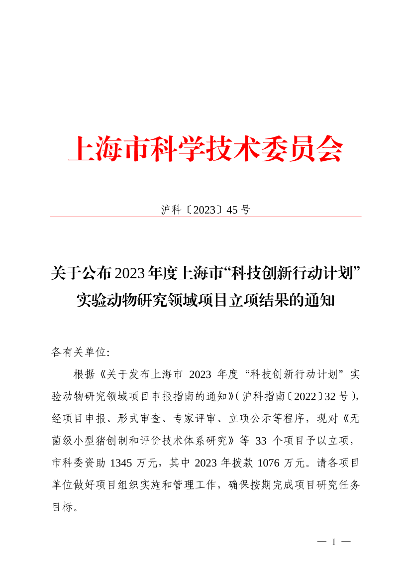 根据《关于发布上海市2023年度“科技创新行动计划”实验动物研究领域项目申报指南的通知》(沪科指南〔2022〕32号),经项目申报、形式审查、专家评审、立项公示等程序,现对《无菌级小型猪创制和评价技术体系研究》等33个项目予以立项,市科委资助1345万元,其中2023年拨款1076万元。请各项目单位做好项目组织实施和管理工作,确保按期完成项目研究任务目标。