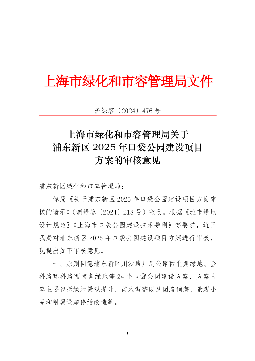 一、原则同意浦东新区川沙路川周公路西北角绿地、金科路环科路西南角绿地等24个口袋公园建设方案,方案内容主要包括绿地景观提升、苗木调整以及园路铺装、景观小品和附属设施修缮改造等。