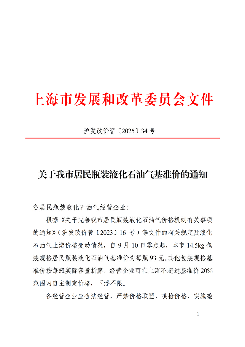 根据《关于完善我市居民瓶装液化石油气价格机制有关事项的通知》(沪发改价管〔2023〕16号)等文件的有关规定及液化石油气上游价格变动情况,自9月10日零点起,本市14.5kg包装规格居民瓶装液化石油气基准价为每瓶93元,其他包装规格基准价按每瓶实际容量折算。经营企业可在上浮不超过基准价20%范围内自主制定价格,下浮不限。