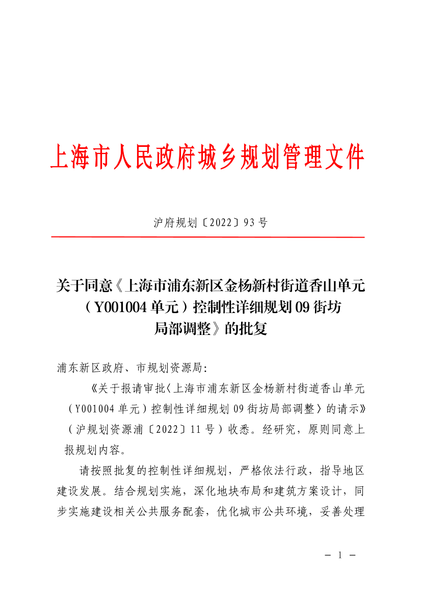 《关于报请审批〈上海市浦东新区金杨新村街道香山单元(Y001004单元)控制性详细规划09街坊局部调整〉的请示》(沪规划资源浦〔2022〕11号)收悉。经研究,原则同意上报规划内容。