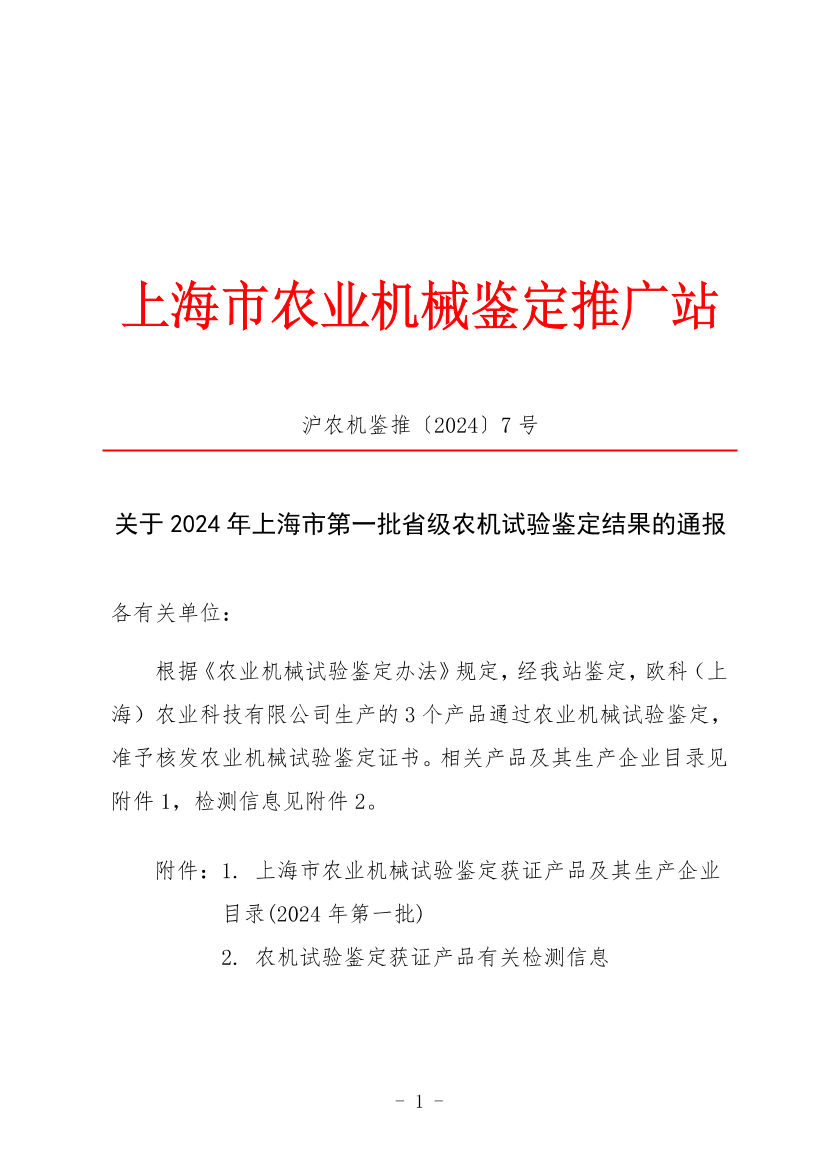 附件:1. 上海市农业机械试验鉴定获证产品及其生产企业目录(2024年第一批)