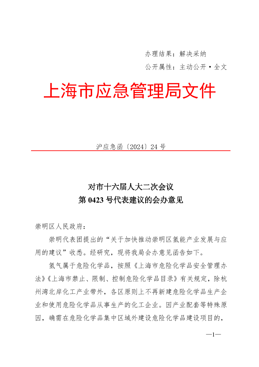 崇明代表团提出的“关于加快推动崇明区氢能产业发展与应用的建议”收悉。经研究,现将我局会办意见函告如下。