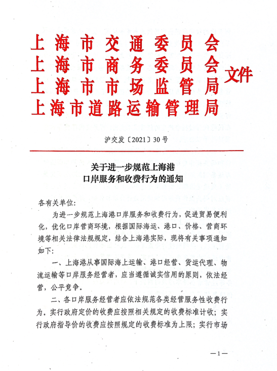 为进一步规范上海港口岸服务和收费行为,促进贸易便利化,优化口岸营商环境,根据国际海运、港口、价格、营商环境等相关法律法规规定,结合上海港实际,现将有关事项通知如下: