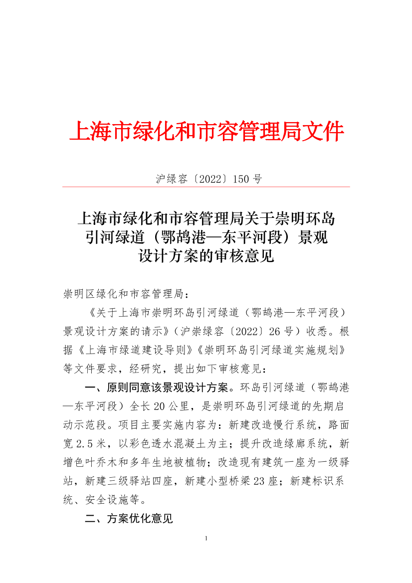 《关于上海市崇明环岛引河绿道(鄂鸪港—东平河段)景观设计方案的请示》(沪崇绿容〔2022〕26号)收悉。根据《上海市绿道建设导则》《崇明环岛引河绿道实施规划》等文件要求,经研究,提出如下审核意见:
