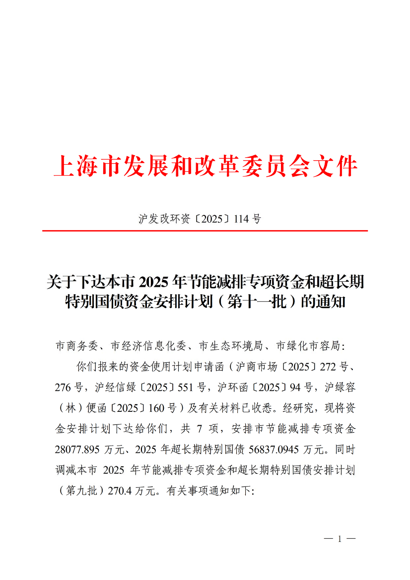 你们报来的资金使用计划申请函(沪商市场〔2025〕272号、276号,沪经信绿〔2025〕551号,沪环函〔2025〕94号,沪绿容(林)便函〔2025〕160号)及有关材料已收悉。经研究,现将资金安排计划下达给你们,共7项,安排市节能减排专项资金28077.895万元、2025年超长期特别国债56837.0945万元。同时调减本市2025年节能减排专项资金和超长期特别国债安排计划(第九批)270.4万元。有关事项通知如下: