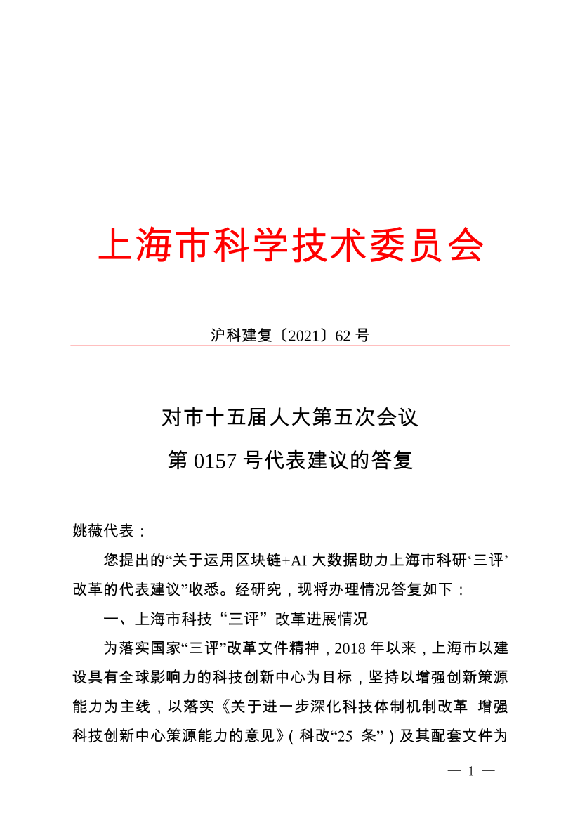 您提出的“关于运用区块链+AI大数据助力上海市科研‘三评’改革的代表建议”收悉。经研究,现将办理情况答复如下: