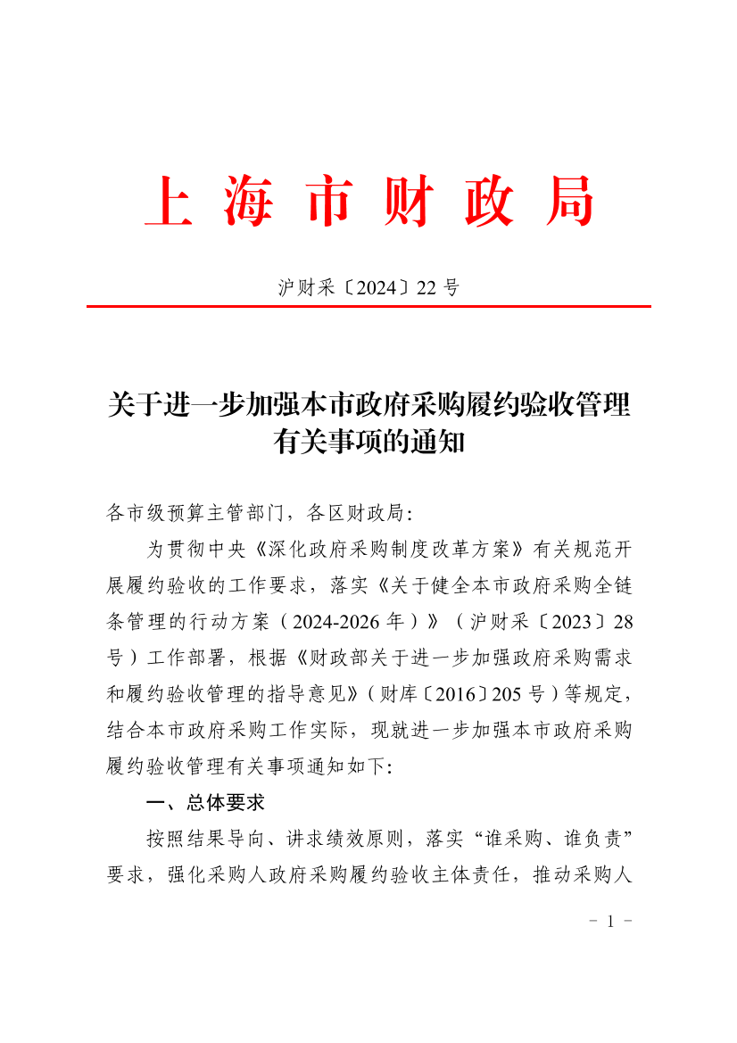 为贯彻中央《深化政府采购制度改革方案》有关规范开展履约验收的工作要求,落实《关于健全本市政府采购全链条管理的行动方案(2024-2026年)》(沪财采〔2023〕28号)工作部署,根据《财政部关于进一步加强政府采购需求和履约验收管理的指导意见》(财库〔2016〕205号)等规定,结合本市政府采购工作实际,现就进一步加强本市政府采购履约验收管理有关事项通知如下: