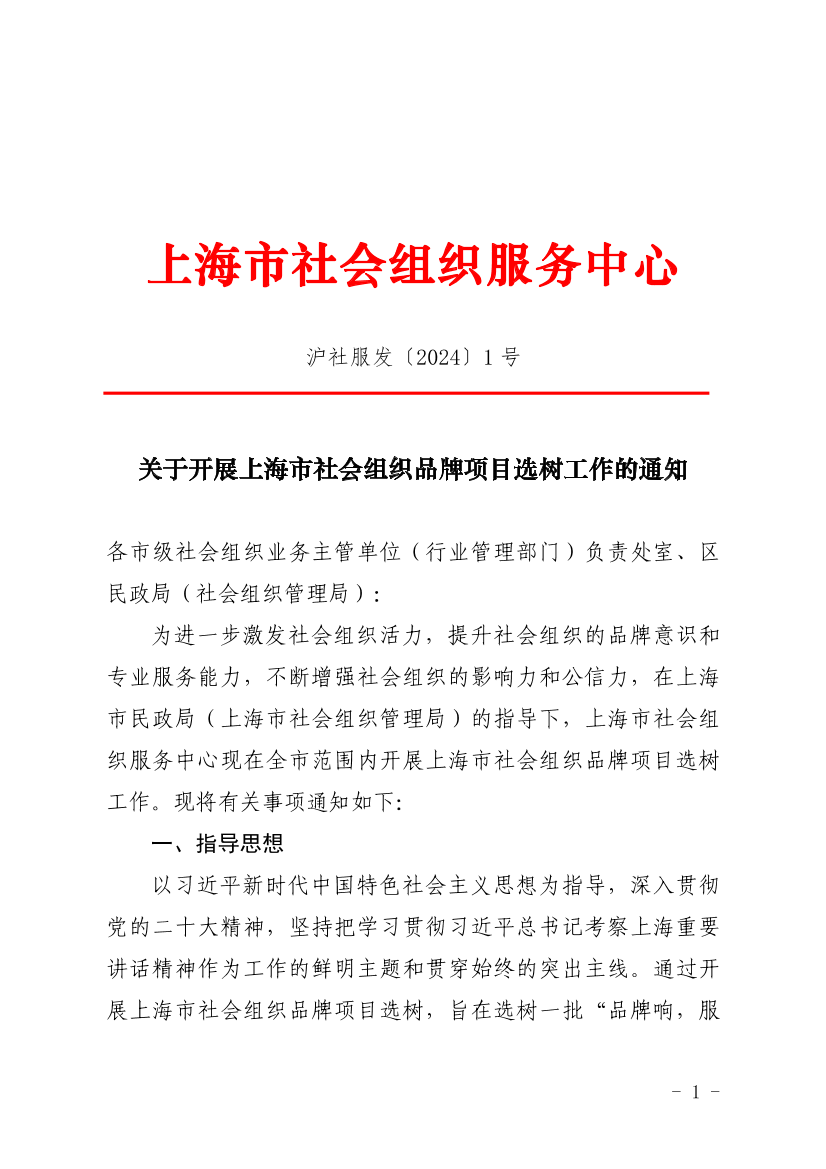 为进一步激发社会组织活力,提升社会组织的品牌意识和专业服务能力,不断增强社会组织的影响力和公信力,在上海市民政局(上海市社会组织管理局)的指导下,上海市社会组织服务中心现在全市范围内开展上海市社会组织品牌项目选树工作。现将有关事项通知如下: