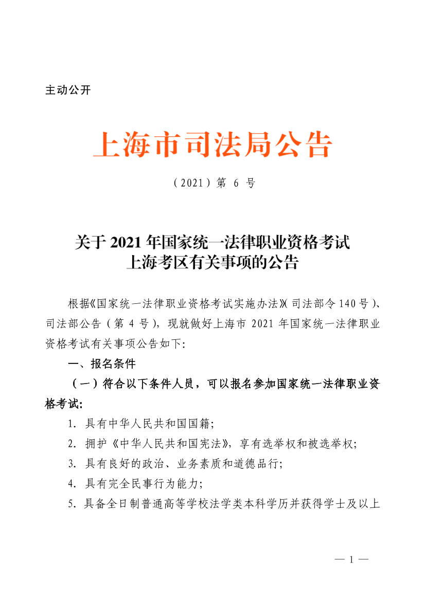 根据《国家统一法律职业资格考试实施办法》(司法部令140号)、司法部公告(第4号),现就做好上海市2021年国家统一法律职业资格考试有关事项公告如下: