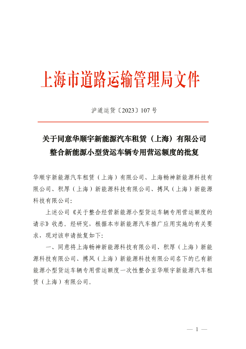 一、同意将上海畅神新能源科技有限公司、积厚(上海)新能源科技有限公司、搏风(上海)新能源科技有限公司名下的已有新能源小型货运车辆专用营运额度一次性整合至华顺宇新能源汽车租赁(上海)有限公司。