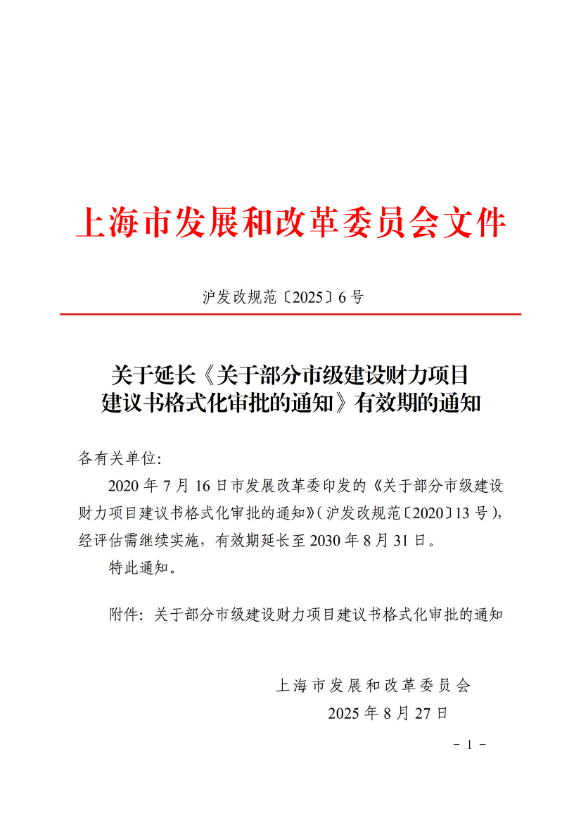 2020年7月16日市发展改革委印发的《关于部分市级建设财力项目建议书格式化审批的通知》(沪发改规范〔2020〕13号),经评估需继续实施,有效期延长至2030年8月31日。