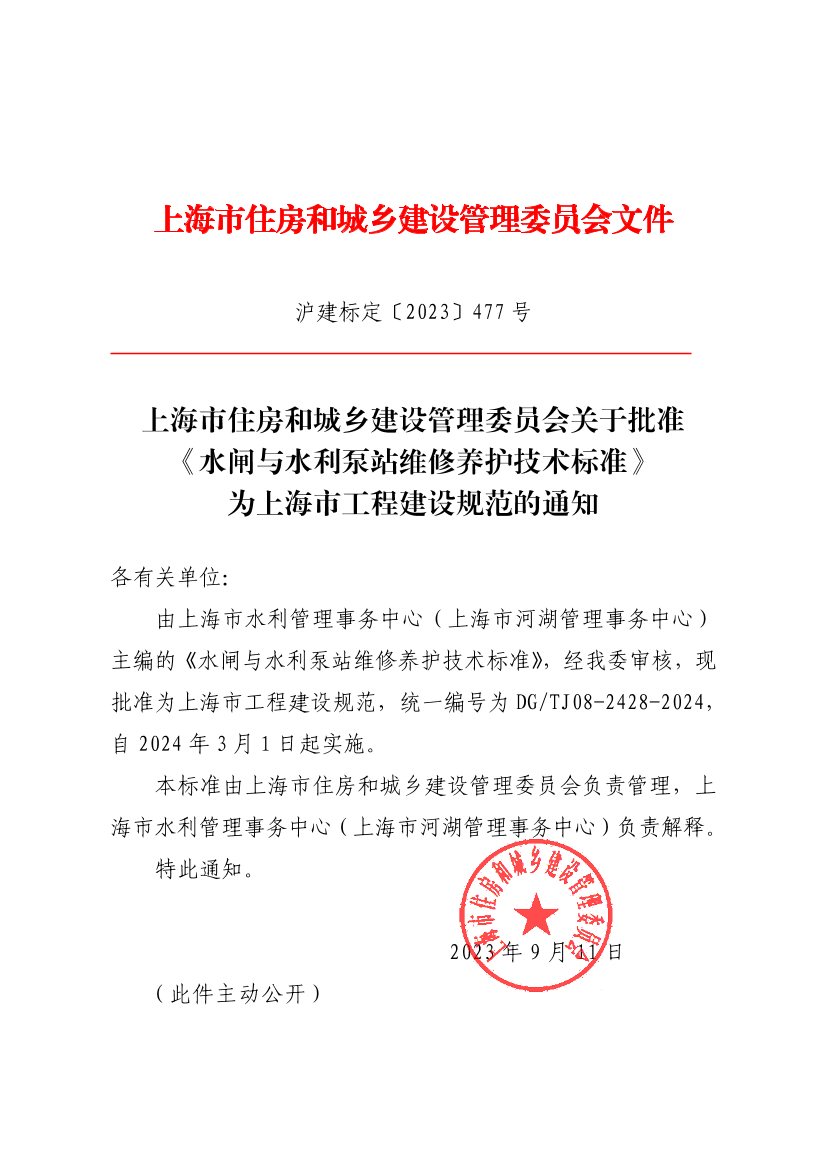 由上海市水利管理事务中心(上海市河湖管理事务中心)主编的《水闸与水利泵站维修养护技术标准》,经我委审核,现批准为上海市工程建设规范,统一编号为DG/TJ08-2428-2024,自2024年3月1日起实施。