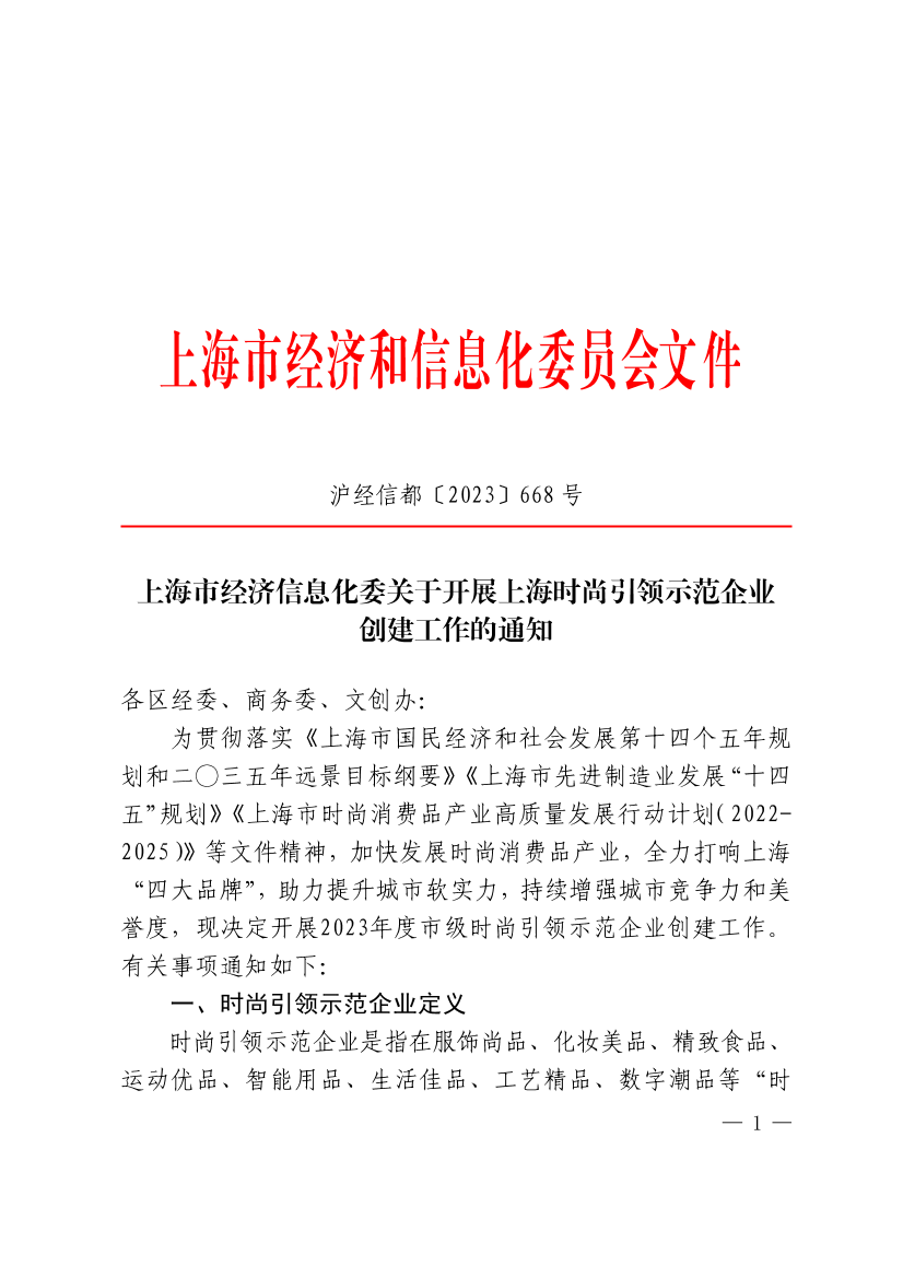 为贯彻落实《上海市国民经济和社会发展第十四个五年规划和二〇三五年远景目标纲要》《上海市先进制造业发展“十四五”规划》《上海市时尚消费品产业高质量发展行动计划(2022-2025)》等文件精神,加快发展时尚消费品产业,全力打响上海“四大品牌”,助力提升城市软实力,持续增强城市竞争力和美誉度,现决定开展2023年度市级时尚引领示范企业创建工作。有关事项通知如下: