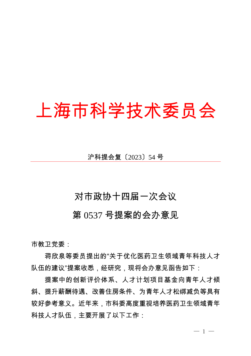 蒋欣泉等委员提出的“关于优化医药卫生领域青年科技人才队伍的建议”提案收悉,经研究,现将会办意见函告如下: