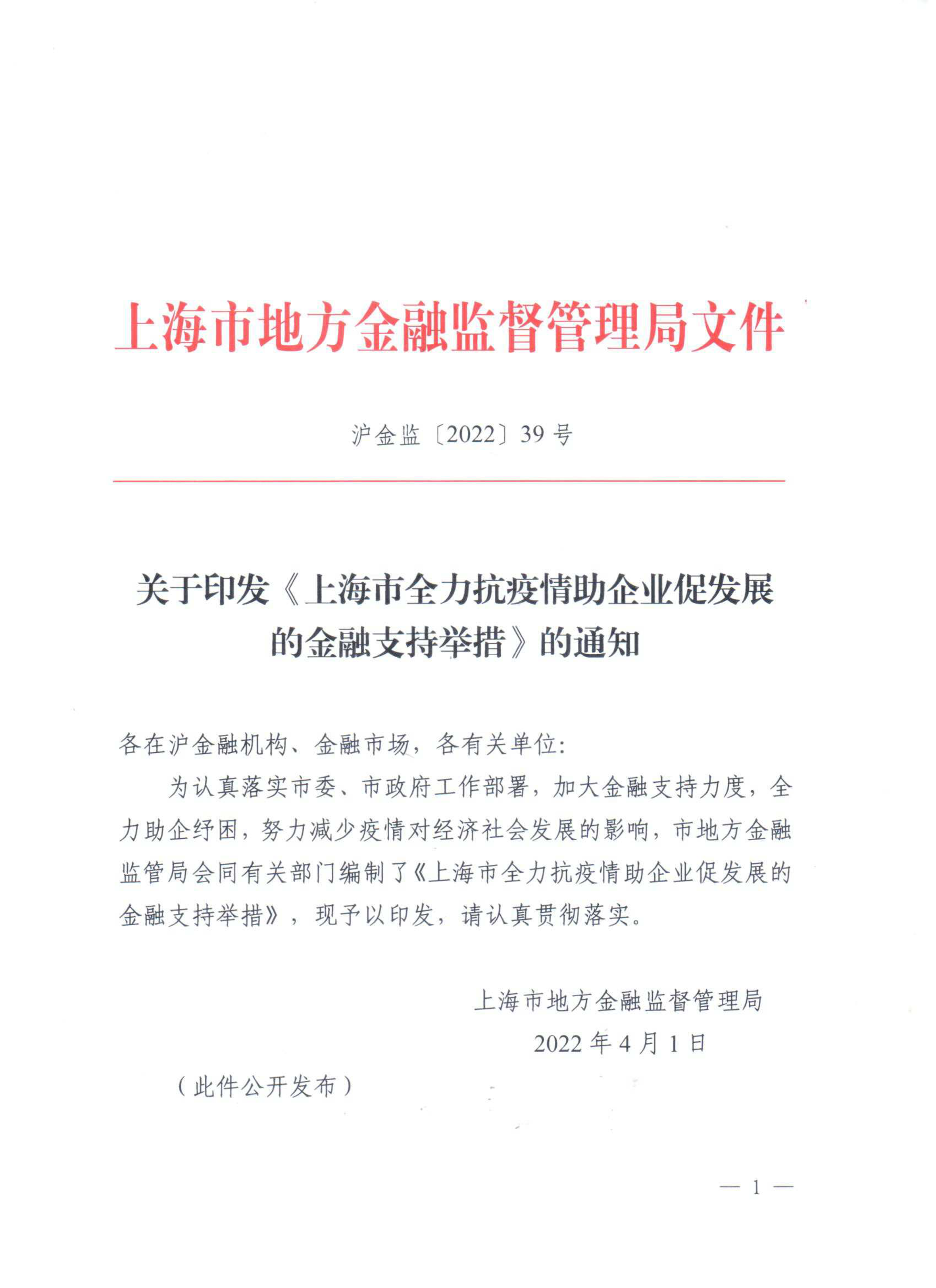 为贯彻落实《上海市全力抗疫情助企业促发展的若干政策措施》,坚持统筹疫情防控和经济社会发展,全力支持受疫情影响行业和企业克服困难、恢复发展,市地方金融监管局会同人民银行上海分行、上海银保监局、上海证监局以及本市相关行业主管部门研究形成了本市抗疫情助企业促发展的金融支持举措,以推动金融机构加大融资支持、降低企业融资成本,提高金融服务的精准性、及时性、有效性,努力减少疫情对经济社会发展的影响。为便利企业了解相关政策,现将本市金融支持举措汇总如下: