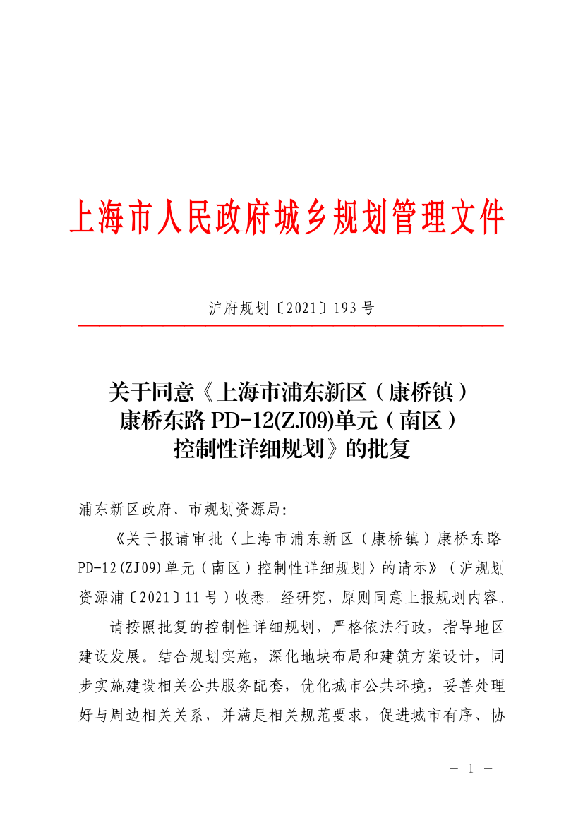 《关于报请审批〈上海市浦东新区(康桥镇)康桥东路PD-12(ZJ09)单元(南区)控制性详细规划〉的请示》(沪规划资源浦〔2021〕11号)收悉。经研究,原则同意上报规划内容。