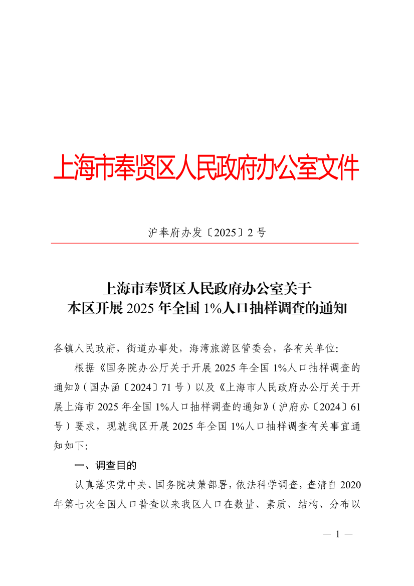 根据《国务院办公厅关于开展2025年全国1%人口抽样调查的通知》(国办函〔2024〕71号)以及《上海市人民政府办公厅关于开展上海市2025年全国1%人口抽样调查的通知》(沪府办〔2024〕61号)要求,现就我区开展2025年全国1%人口抽样调查有关事宜通知如下: