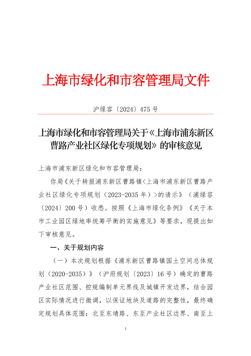 你局《关于转报浦东新区曹路镇<上海市浦东新区曹路产业社区绿化专项规划(2023-2035年)>的请示》(浦绿容〔2024〕200号)收悉。按照《上海市绿化条例》《关于本市工业园区绿地率统筹平衡的实施意见》等要求,现提出如下审核意见。