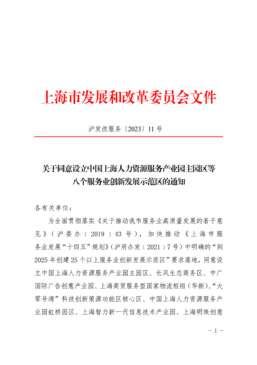 为全面贯彻落实《关于推动我市服务业高质量发展的若干意见》(沪委办﹝2019﹞43号),加快推动《上海市服务业发展“十四五”规划》(沪府办发﹝2021﹞7号)中明确的“到2025年创建25个以上服务业创新发展示范区”要求落地,同意设立中国上海人力资源服务产业园主园区、长风生态商务区、中广国际广告创意产业园、上海商贸服务型国家物流枢纽(华新)、“大零号湾”科技创新策源功能区核心区、中国上海人力资源服务产业园虹桥园区、上海智力新一代信息技术产业园、上海明珠创意产业园等八个市服务业创新发展示范区(以下简称示范区)。有关事项通知如下。