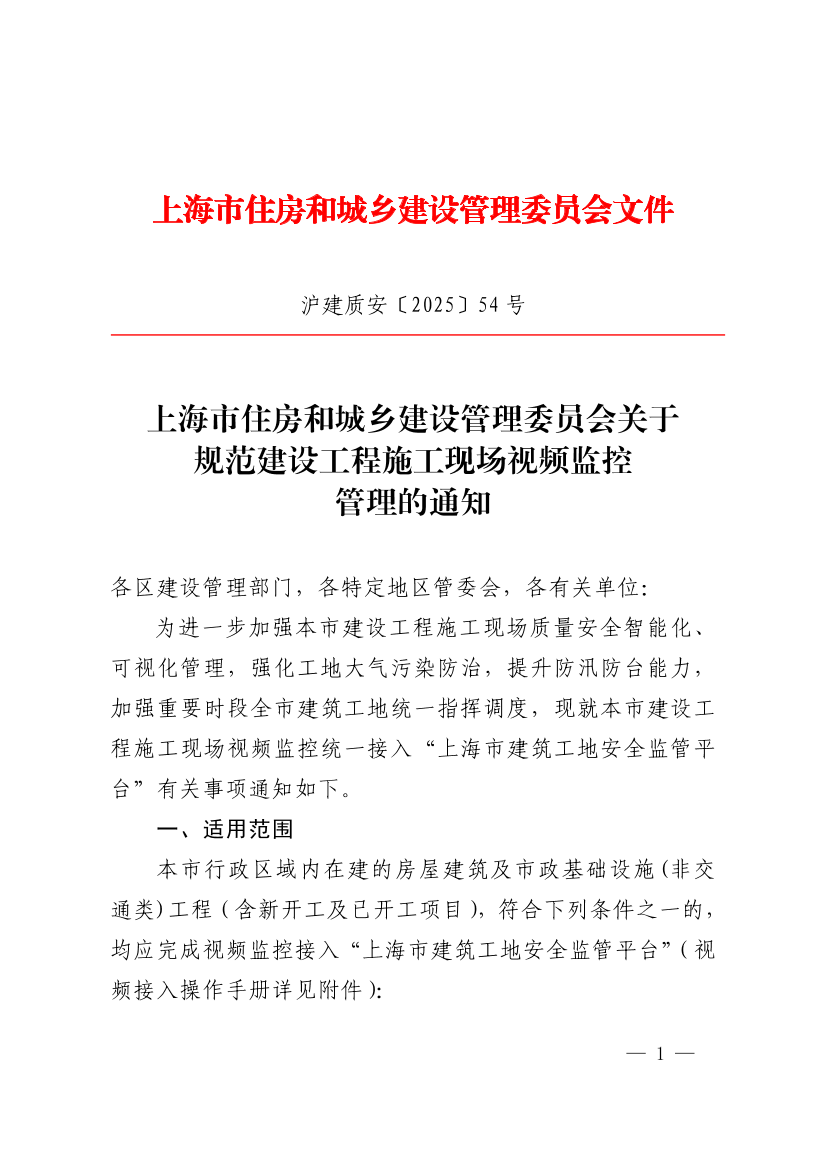 本市行政区域内在建的房屋建筑及市政基础设施(非交通类)工程(含新开工及已开工项目),符合下列条件之一的,均应完成视频监控接入“上海市建筑工地安全监管平台”(视频接入操作手册详见附件):