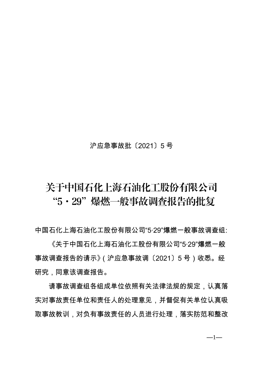 《关于中国石化上海石油化工股份有限公司“5·29”爆燃一般事故调查报告的请示》(沪应急事故调〔2021〕5号)收悉。经研究,同意该调查报告。