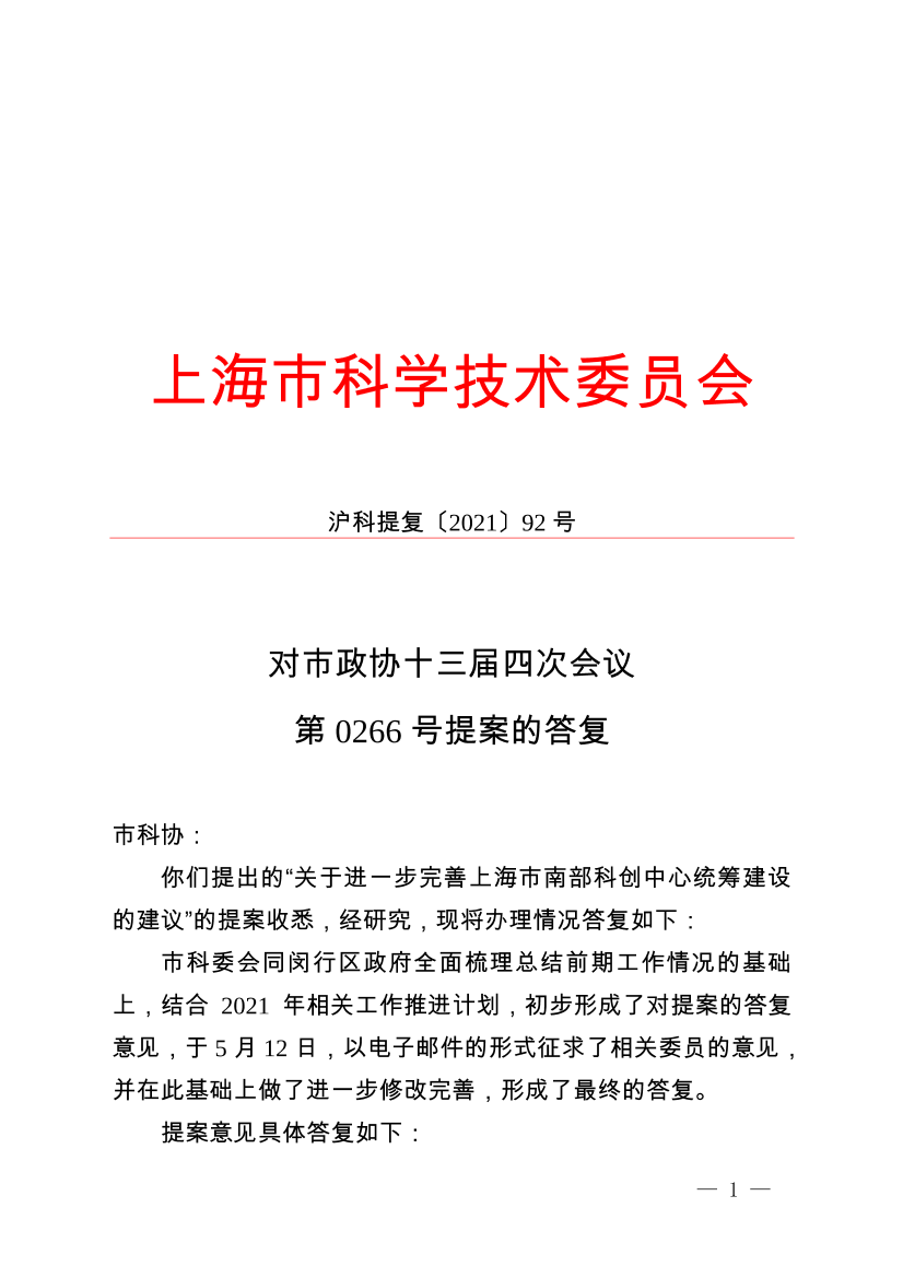 你们提出的“关于进一步完善上海市南部科创中心统筹建设的建议”的提案收悉,经研究,现将办理情况答复如下: