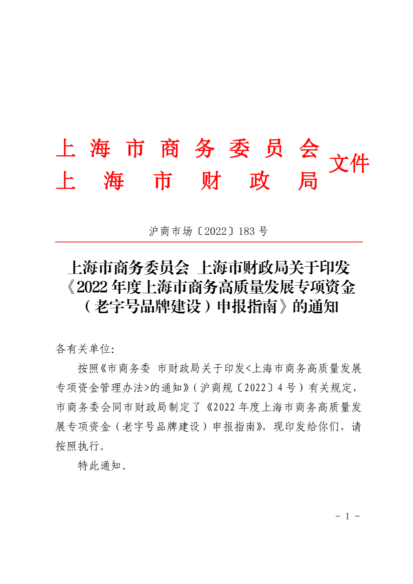 按照《市商务委 市财政局关于印发<上海市商务高质量发展专项资金管理办法>的通知》(沪商规〔2022〕4号)有关规定,市商务委会同市财政局制定了《2022年度上海市商务高质量发展专项资金(老字号品牌建设)申报指南》,现印发给你们,请按照执行。