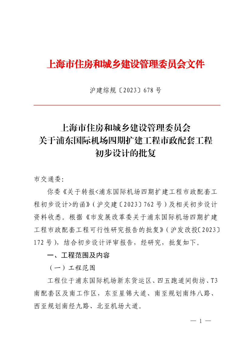 你委《关于转报<浦东国际机场四期扩建工程市政配套工程初步设计>的函》(沪交建〔2023〕762号)及相关初步设计资料收悉。根据《市发展改革委关于浦东国际机场四期扩建工程市政配套工程可行性研究报告的批复》(沪发改投〔2023〕172号),结合初步设计评审报告,经研究,批复如下。