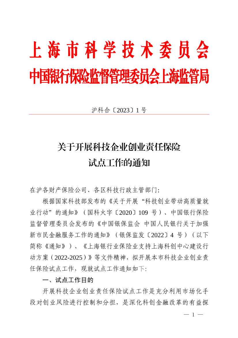 根据国家科技部发布的《关于开展“科技创业带动高质量就业行动”的通知》(国科火字〔2020〕109号)、中国银行保险监督管理委员会发布的《中国银保监会中国人民银行关于加强新市民金融服务工作的通知》(银保监发〔2022〕4号)(以下简称《通知》)、《上海银行业保险业支持上海科创中心建设行动方案(2022-2025)》等文件精神,拟开展本市科技企业创业责任保险试点工作,现就试点工作通知如下: