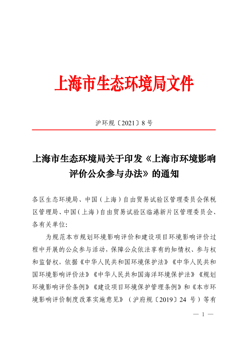 为规范本市规划环境影响评价和建设项目环境影响评价过程中开展的公众参与活动,保障公众依法享有的知情权、参与权和监督权,依据《中华人民共和国环境保护法》《中华人民共和国环境影响评价法》《中华人民共和国海洋环境保护法》《规划环境影响评价条例》《建设项目环境保护管理条例》和《本市环境影响评价制度改革实施意见》(沪府规〔2019〕24号)等有关规定,结合本市实际,我局研究制定了《上海市环境影响评价公众参与办法》。现印发给你们,请认真遵照执行。