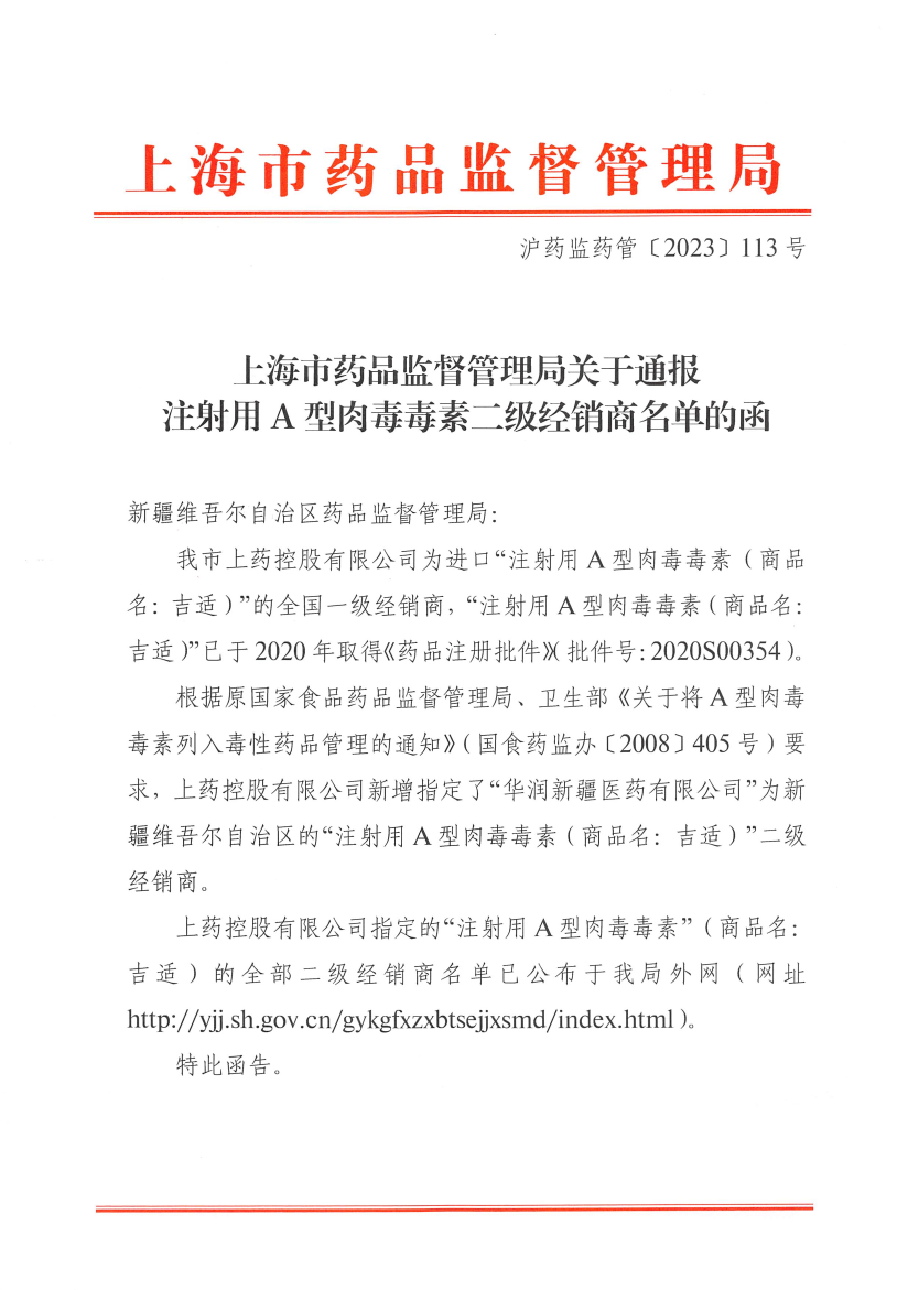 根据原国家食品药品监督管理局、卫生部《关于将A型肉毒毒素列入毒性药品管理的通知》(国食药监办〔2008〕405号)要求,上药控股有限公司新增指定了“华润新疆医药有限公司”为新疆维吾尔自治区的“注射用A型肉毒毒素(商品名:吉适)”二级经销商。