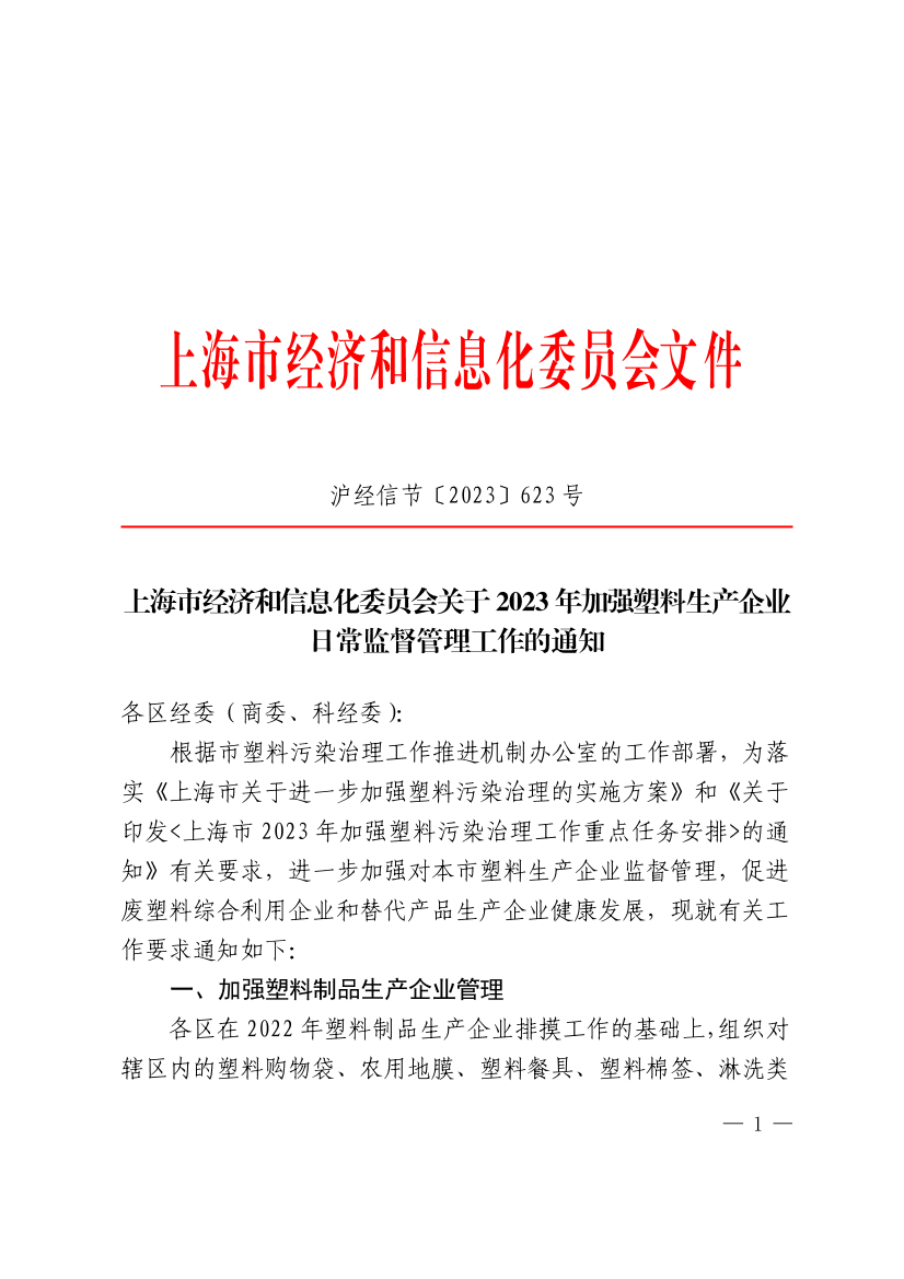 根据市塑料污染治理工作推进机制办公室的工作部署,为落实《上海市关于进一步加强塑料污染治理的实施方案》和《关于印发<上海市2023年加强塑料污染治理工作重点任务安排>的通知》有关要求,进一步加强对本市塑料生产企业监督管理,促进废塑料综合利用企业和替代产品生产企业健康发展,现就有关工作要求通知如下: