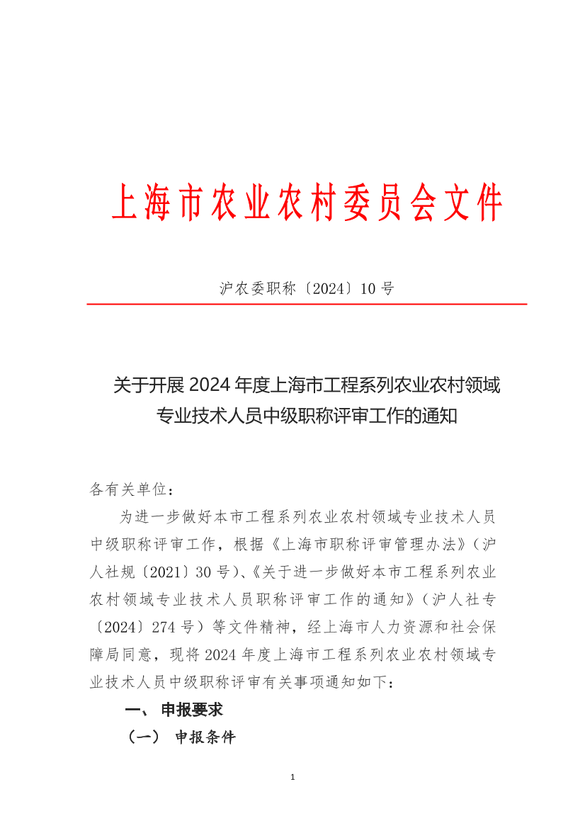 为进一步做好本市工程系列农业农村领域专业技术人员中级职称评审工作,根据《上海市职称评审管理办法》(沪人社规〔2021〕30号)、《关于进一步做好本市工程系列农业农村领域专业技术人员职称评审工作的通知》(沪人社专〔2024〕274号)等文件精神,经上海市人力资源和社会保障局同意,现将2024年度上海市工程系列农业农村领域专业技术人员中级职称评审有关事项通知如下: