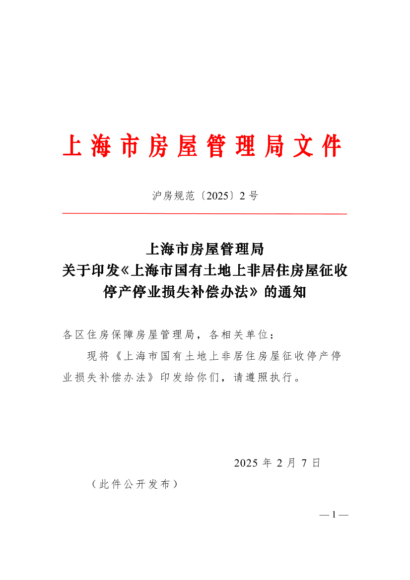 关于印发《上海市国有土地上非居住房屋征收停产停业损失补偿办法》的通知