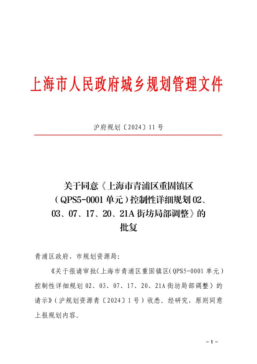 《关于报请审批〈上海市青浦区重固镇区(QPS5-0001单元)控制性详细规划02、03、07、17、20、21A街坊局部调整〉的请示》(沪规划资源青〔2024〕1号)收悉。经研究,原则同意上报规划内容。