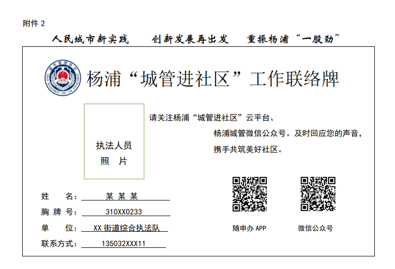 (一)健全日常联系服务机制。在全区12个街道各居委会推进设立杨浦城管社区工作室,在长阳创谷、杨浦滨江等设立杨浦城管园区工作站;在各室(站)明确1-2名城管队员作为“城管进社区”综合治理服务工作联络员,负责城管执法事项的受理查处、咨询服务、普法宣传、矛盾调处等工作;在社区的每幢楼栋,设置杨浦“城管进社区”工作联络牌(附件2),公开联络员的姓名、联系方式、主要执法事项以及“城管进社区”工作二维码。通过织密“城管进社区”综合治理服务工作网,让社区居民、园区企业真切感受到执法保障零距离、执法服务面对面,遇事能够找得到、问得清、有回音。