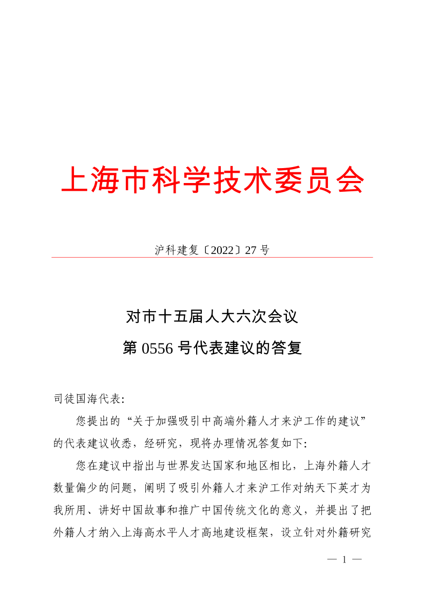 您提出的“关于加强吸引中高端外籍人才来沪工作的建议”的代表建议收悉,经研究,现将办理情况答复如下: