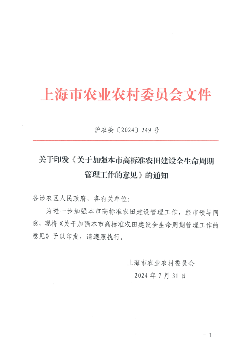 关于加强本市高标准农田建设全生命周期管理工作的意见