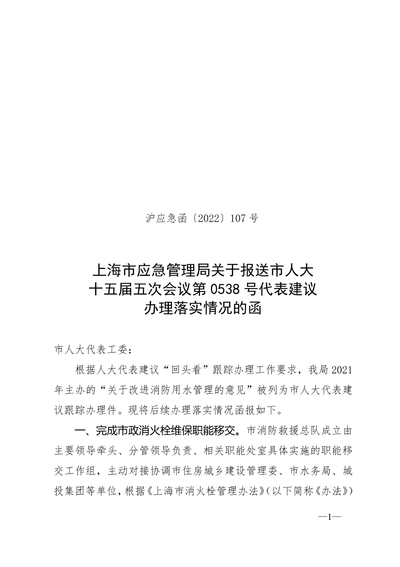根据人大代表建议“回头看”跟踪办理工作要求,我局2021年主办的“关于改进消防用水管理的意见”被列为市人大代表建议跟踪办理件。现将后续办理落实情况函报如下。