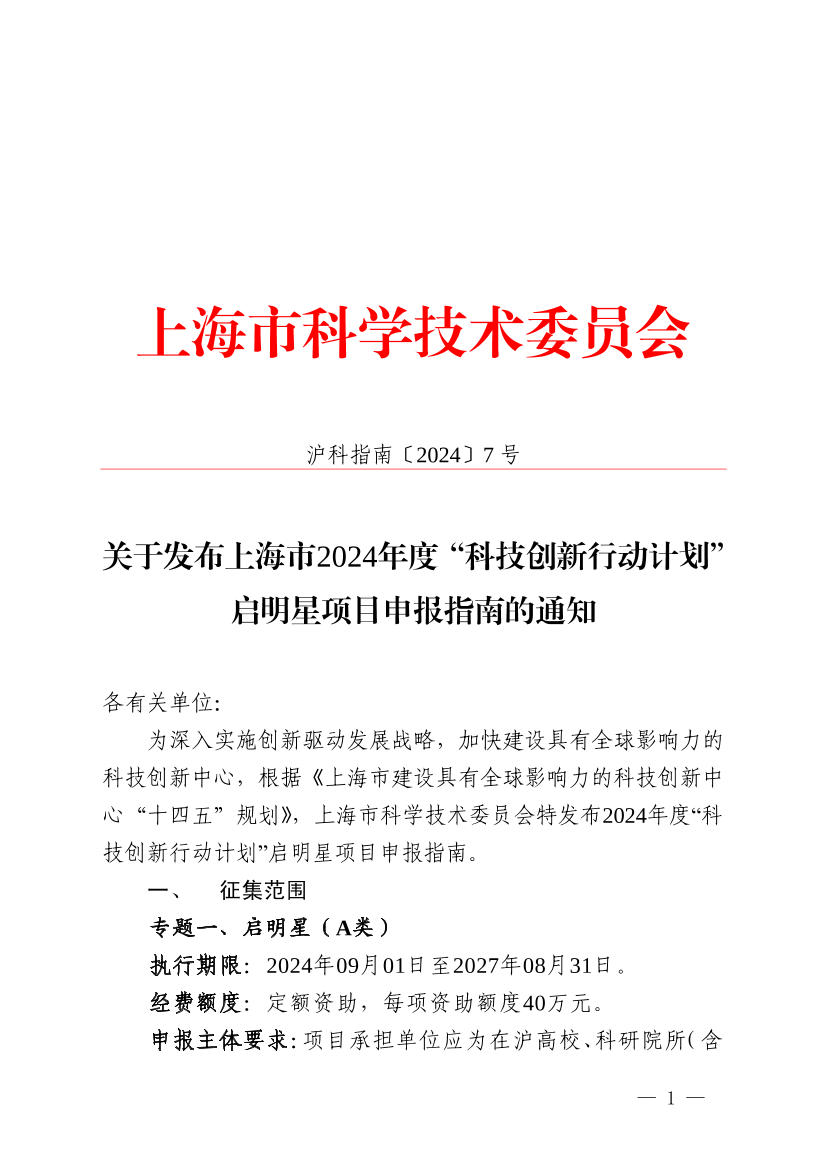 为深入实施创新驱动发展战略,加快建设具有全球影响力的科技创新中心,根据《上海市建设具有全球影响力的科技创新中心“十四五”规划》,上海市科学技术委员会特发布2024年度“科技创新行动计划”启明星项目申报指南。