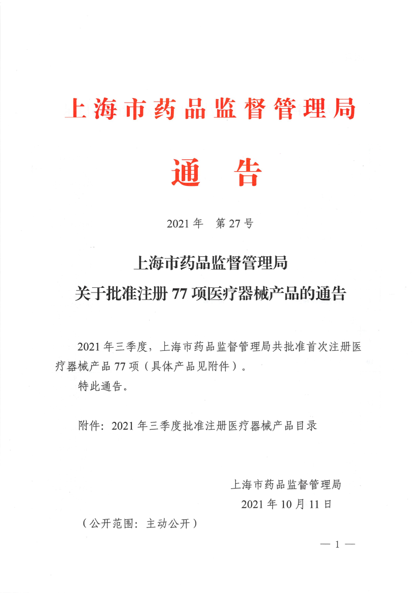 2021年三季度,上海市药品监督管理局共批准首次注册医疗器械产品77项(具体产品见附件)。