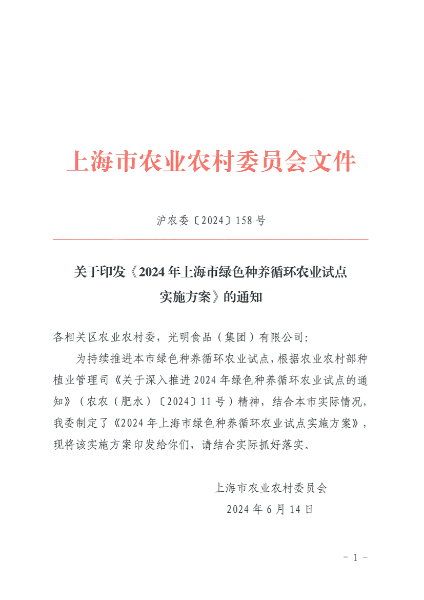 为持续推进本市绿色种养循环农业试点,根据农业农村部种植业管理司《关于深入推进2024年绿色种养循环农业试点的通知》(农农(肥水)〔2024〕11号)精神,结合本市实际情况,我委制定了《2024年上海市绿色种养循环农业试点实施方案》,现将该实施方案印发给你们,请结合实际抓好落实。