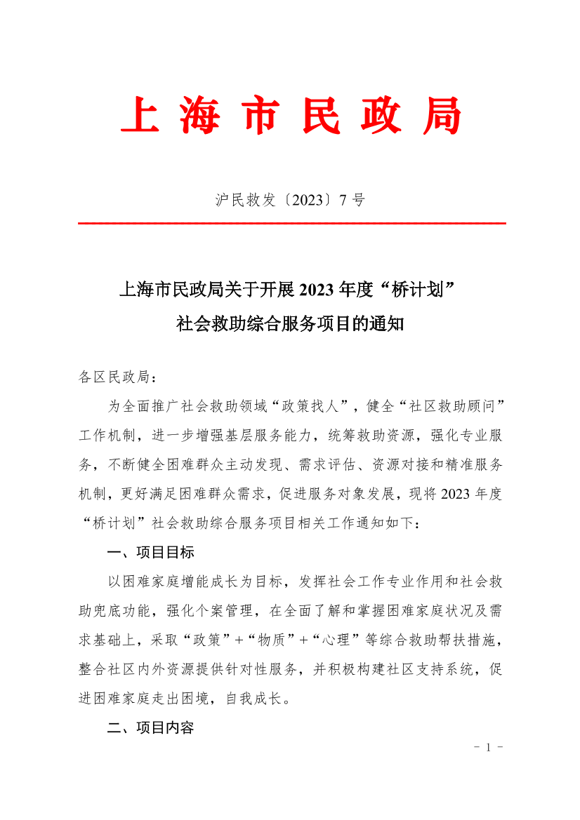 为全面推广社会救助领域“政策找人”,健全“社区救助顾问”工作机制,进一步增强基层服务能力,统筹救助资源,强化专业服务,不断健全困难群众主动发现、需求评估、资源对接和精准服务机制,更好满足困难群众需求,促进服务对象发展,现将2023年度“桥计划”社会救助综合服务项目相关工作通知如下: