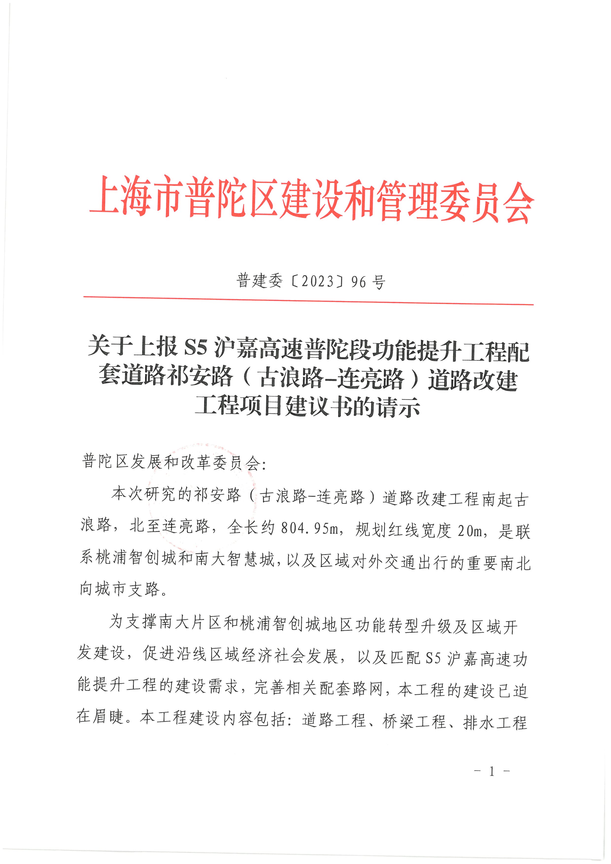 本次研究的祁安路(古浪路-连亮路)道路改建工程南起古浪路,北至连亮路,全长约804.95m,规划红线宽度20m,是联系桃浦智创城和南大智慧城,以及区域对外交通出行的重要南北向城市支路。