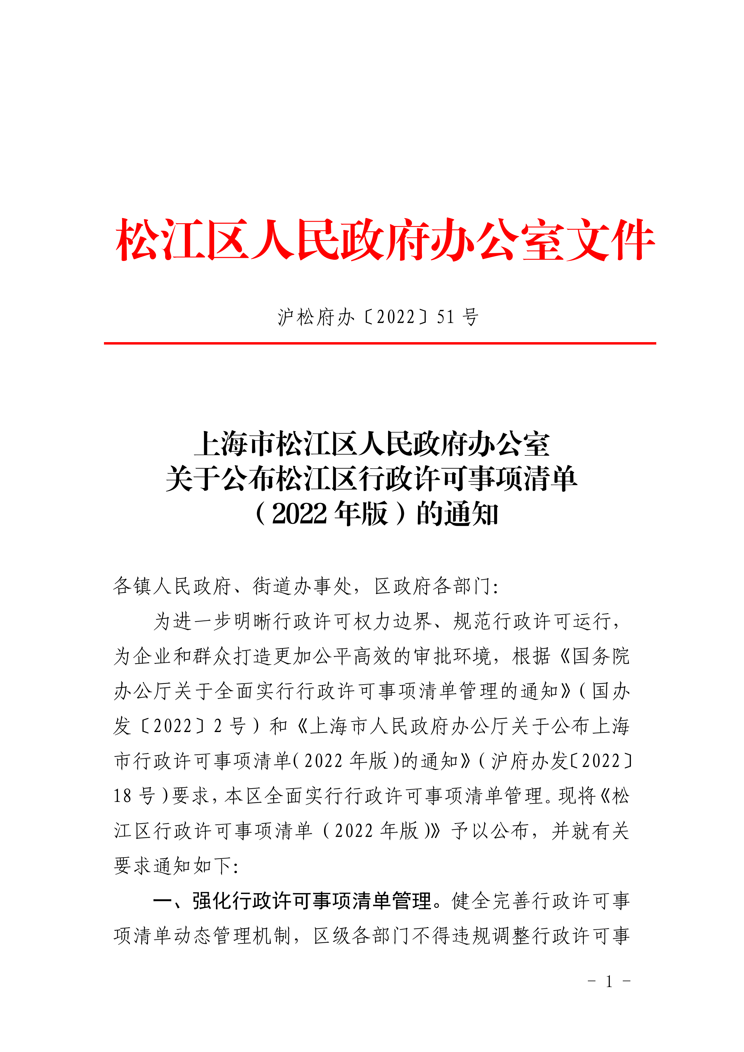 为进一步明晰行政许可权力边界、规范行政许可运行,为企业和群众打造更加公平高效的审批环境,根据《国务院办公厅关于全面实行行政许可事项清单管理的通知》(国办发〔2022〕2号)和《上海市人民政府办公厅关于公布上海市行政许可事项清单(2022年版)的通知》(沪府办发〔2022〕18号)要求,本区全面实行行政许可事项清单管理。现将《松江区行政许可事项清单(2022年版)》予以公布,并就有关要求通知如下: